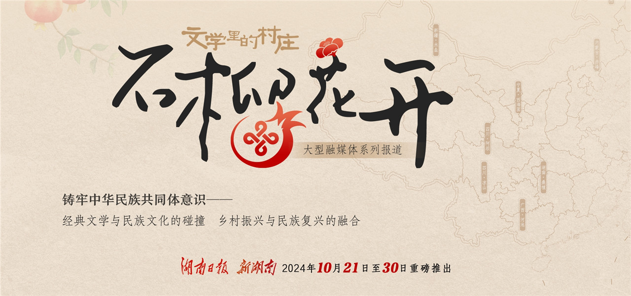 在習近平總書記鮮明提出“中華民族共同體意識”10周年及文藝工作座談會召開10周年之際,在全國民族團結進步表彰大會剛剛落幕之時,湖南日報精選8位作家和他們多個獎項的作品,派出8路融媒體團隊,奔赴多彩的民族村莊進行采訪。精選民族經典,穿越大美中國。自10月21日起,湖南日報推出《文學里的村莊·石榴花開》大型融媒體系列報道,書寫民族村莊的時代巨變,描繪各民族如石榴籽一樣緊緊抱在一起,共建美好家園的壯美畫卷。