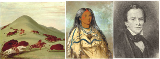 喬治·卡特林1796年生在賓夕法尼亞州的一個白人家庭。25歲,他放棄了地方資產者倚重的律師生財之道,離開妻子和兒女,全身心投入為印第安 人畫像的事業。他深入“平原印第安人”的各個“紅皮膚”種族部落寫生,短短幾年,畫就了500多幅印第安人肖像及生活圖景。他揮筆實地寫生,展現美洲原住 民隨著白人大肆屠殺野牛而失去主要生活依靠的困境。卡特林的作品并非單純的美術,考慮的是從人種生態學角度反映白人殖民者的貪婪給整個印第安民族造成的生 存危機,與美國好萊塢“西部片”里一味將印第安部落歪曲成野蠻殺害白人的元兇截然不同。而且,卡特林跟印第安人同吃住,穿戴他們的服飾,幾乎成了土著部族 的一員。除了繪畫,他全面關注印第安人的文化藝術,收集他們的雕塑和刺繡等手工藝品,于1838年建立了“印第安藝術館”。