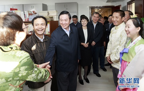 中共中央政治局委員、中央書記處書記、中宣部部長劉奇葆到作家出版集團(tuán)調(diào)研文學(xué)期刊發(fā)展情況。 新華社記者丁海濤攝