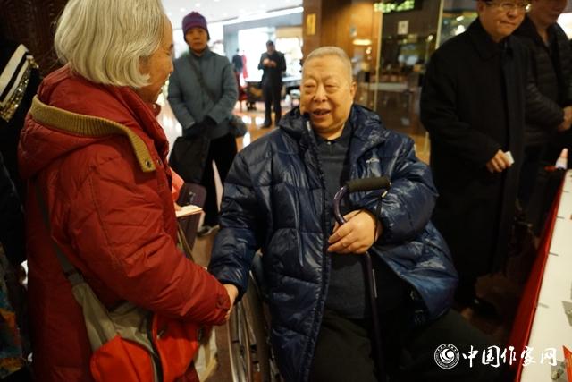 11月29日,中國(guó)作協(xié)第九次全國(guó)代表大會(huì)與會(huì)代表李希凡和張曉風(fēng)見面握手交談。
