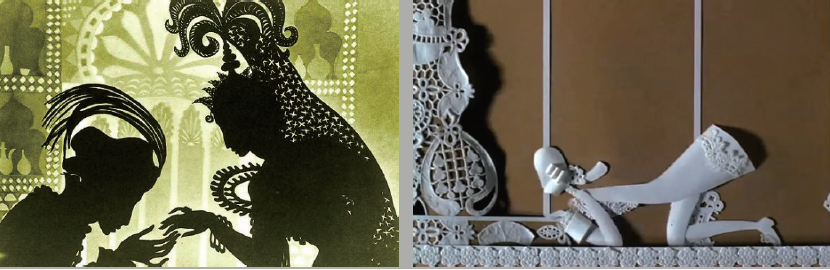 剪影動畫與剪紙動畫有相似之處,即角色都用剪紙方式制作,并根據動作需求將肢體拆分為元件。不同之處在于,剪影動畫通過光線對角色的照射在銀幕上呈現出黑色的輪廓剪影,造型沒有進行顏色的區分,增強整體感的同時也摒棄了影調的細節。世界上較早采用剪影這一形式進行動畫創作的是德國女導演洛特·雷妮格,她最著名的作品是1919年的長片動畫《阿基米德王子歷險記》。雷妮格的剪影作品精致細膩,可惜的是,《阿基米德王子歷險記》的電影膠片在二戰中遭到損毀,遺失了部分背景細節。在修復后,由于放映速度的問題,影片長度也由90分鐘縮短為65分鐘。