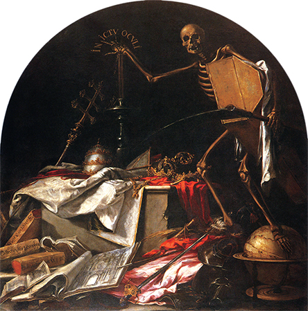 《一瞬之間》的下半部是光輝燦爛的,是精心繪出的靜物:教皇的十字架和冠冕、紅衣主教的法冠、西班牙君王的冠冕、權(quán)杖、武士的甲胄、寶劍、書本、地球儀……它們是權(quán)力、財(cái)富和知識(shí)的象征,代表榮華富貴的人生,這種種令人眷戀的寶物,即將被籠罩在完全的黑暗之中,因?yàn)樗郎褚呀?jīng)以骷髏的形象現(xiàn)身,左手握著收割生靈的黑色鐮刀,腋下夾著裹尸布和棺材,右手無情地熄滅了代表生命之光的燭火。燭火上方的拉丁文“IN ICTU OCULI”就是畫作的題眼,直譯過來就是“眼睛一開一合的工夫”。人生在世,就是一眨眼的工夫,一切成功不過是過眼煙云,再大的輝煌也是頃刻之間就會(huì)被死神吞噬,各種財(cái)富也隨之化為烏有。