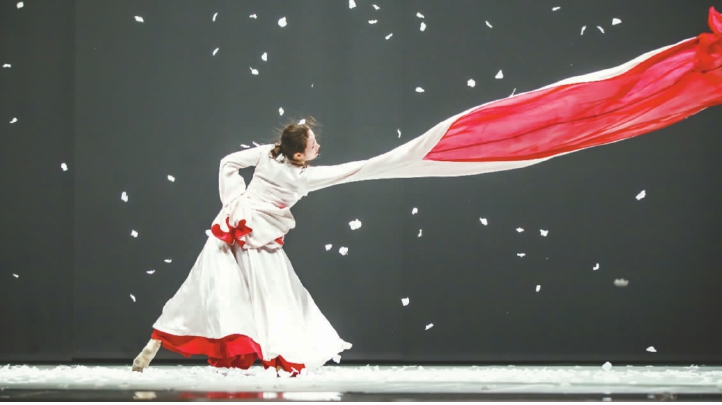 堪與上述影像的“豐富性”相媲美的,是舞劇中“對比性”影像的設計。其中有一段舞者亞彬和她先前拍攝的動態形象的“雙人舞” ,是一個實體的舞者和她虛幻影像的“共舞” 。就影像技術而言,這可能并非什么難題;難能可貴的是這個影像“對比性”的創意,更難能可貴的是這個“對比性”對于揭示人物性格的重要意義——我們注意到,舞者亞彬沿底幕由上場門向下場門舞去,天幕上追隨的“影像”宛若追光為舞者留下的“投影” ;但在舞者縱然躍起之際,那“影像”卻全然不顧舞者已然墜地,自己在無引力的世界中飄逸……那個“影像”是曾經的筱燕秋,是那個孤傲冷艷的嫦娥。嫦娥的飛升是否是人類對自由之境的向往,我們不得而知,但那時我們肯定不知道是月球只有地球六分之一的引力讓人類更自由的飄逸。這使得我們有所悟覺,原來人類的不堪重負在于“自身”的放不下,在于“患失”不“患得” 、“欲罷而不能” !