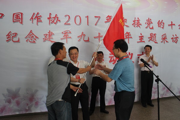 2017年是中國(guó)人民解放軍建軍九十周年。為緬懷革命先烈,以文學(xué)形式謳歌我國(guó)軍隊(duì)建設(shè)的巨大成就,7月9日,中國(guó)作協(xié)“迎接黨的十九大暨紀(jì)念建軍九十周年”主題采訪活動(dòng)在八一起義發(fā)生地江西南昌舉行啟動(dòng)儀式。中國(guó)作協(xié)副主席閻晶明出席啟動(dòng)儀式,向采訪團(tuán)作家代表授旗。江西省委宣傳部副部長(zhǎng)朱民安、江西省文聯(lián)黨組書記鄭翔、江西省文聯(lián)主席葉青,以及首批采訪團(tuán)20余位作家和江西省作家代表50余人參加。啟動(dòng)儀式由中國(guó)作協(xié)創(chuàng)聯(lián)部副主任馮秋子主持。