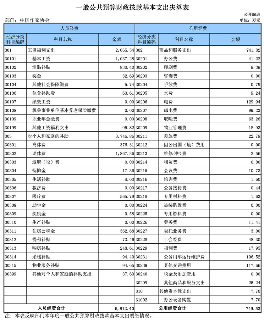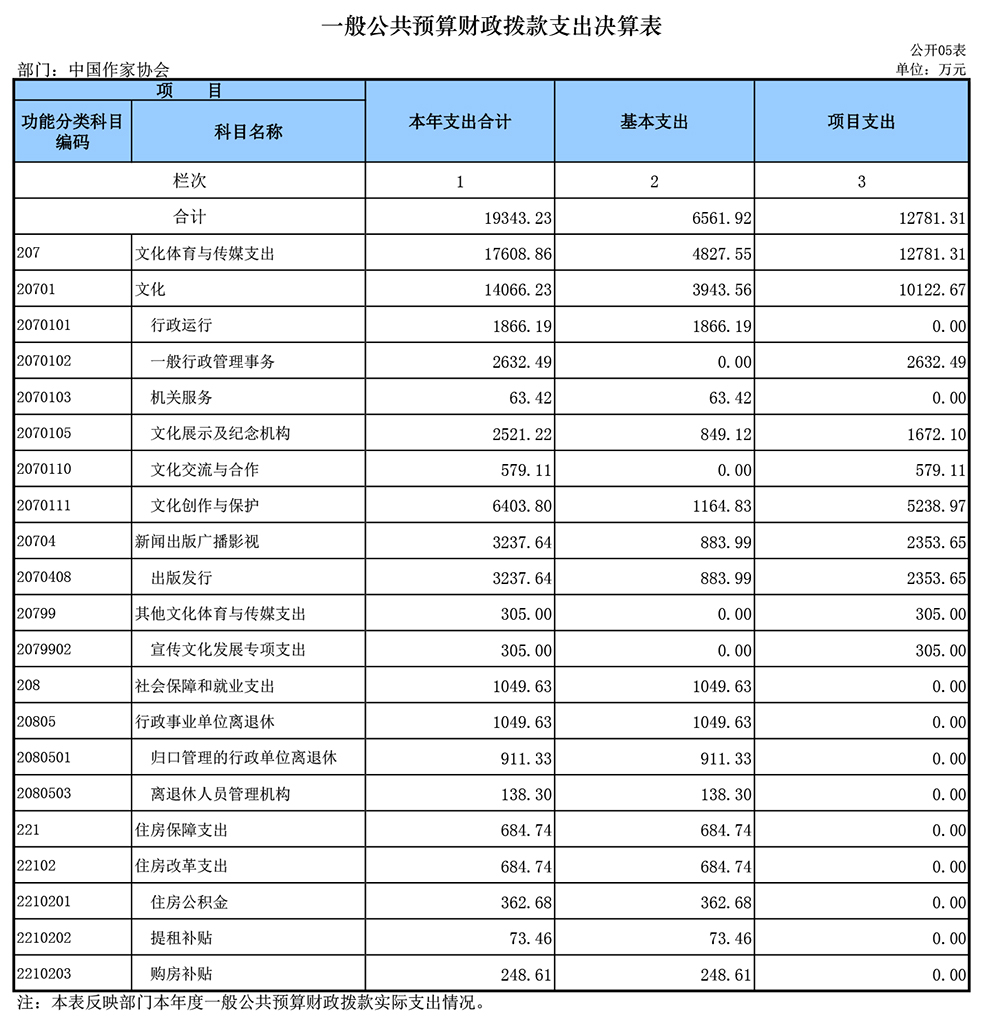 七、文化體育與傳媒(類)文化(款)行政運行(項):指中國作協本級行政人員工資及機構正常運轉、履行職責所需的基本支出。