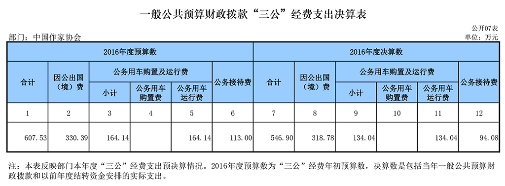 中國作協2016年財政撥款“三公”經費支出預算為607.53萬元,其中:因公出國(境)費330.39萬元,公務用車運行費164.14萬元,公務接待費113萬元。