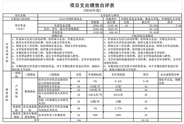 根據年初設定的績效目標, “文學創作與研究”項目自評得分為93.55 分。發現的主要問題及原因:一是年初設置的個別指標不合理;二是部分二級項目執行進度較慢。下一步改進措施:增強指標設置的科學性,加快預算執行進度。