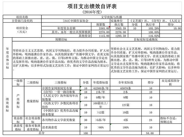 “文學出版與傳播”項目自評得分為94 分。發現的主要問題及原因:部分績效指標設置預期偏高,預算執行過程中完成難度較大。下一步改進措施:結合實際情況,合理設置績效目標。