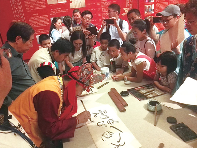 在北京站的巡展現場,身著民族服裝的東巴現場書寫的東巴文字成了觀眾們熱搶的目標,觀眾們手拿東巴紙,排隊等著東巴寫下自己想要的吉祥語——“天道酬勤”“吉祥幸福”……