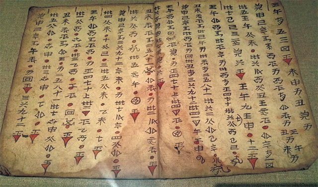 東巴文《東巴舞譜》,為納西族古老的宗教東巴教記錄和傳授跳神舞蹈的儀式程序、內容、跳法的一種經典。共記錄了34種東巴舞蹈。