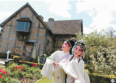 ③為紀念湯顯祖和莎士比亞逝世400周年,來自湯顯祖的故鄉中國江西撫州的演員在英國莎士比亞故居花園表演戲曲。新華社發