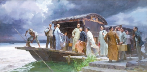 在我心中兩張稿子都是難以割舍的。在整個構思的過程中,我反復查閱了大量有關一大的資料,其中一大代表的生平深深地觸動了自己,深感一大代表身上都流淌著要改變舊中國的一腔熱血。他們當時是一群年輕的、自覺的、渴望肩負國家及民族命運的知識分子,暫且不說其中某些人的歷史命運發生了何種變化,我的內心很希望能將參加南湖會議的全部代表都在畫中有所表現。所以,我在畫稿中盡量想安排好每個代表出場位置。根據李達夫人王會悟的回憶,南湖紅船并不能直接停靠煙雨樓前的碼頭,而是停在湖中,由一只小船(稱拖捎船)往來于碼頭與大船之間接送客人。如果表現這樣方式上船,很難表達出我想將一大代表全部畫進去的初衷,于是我設想一大代表由碼頭邊的跳板上船,這樣的安排可以將一大代表較為輕松地安排在畫面中。而且這樣畫面容易體現出會議的莊重,然后我盡量加重畫面的色調,強化了風雨前的效果,將光線斷斷續續地集中在代表身上,使畫面的神秘感有所加強,也使較多的人物在空間展開時有主次之分。這張構圖在人物表現的主次關系中,側重于2002年中共黨史新編中的排序,突出了李達、李漢俊、陳潭秋和董必武的地位,青年毛澤東則緊隨其后。后來,在我的合作者黃發祥老師的協助下,歷時七個月的緊張工作,完成了這張5米長、 2 . 5米高的創作。作品完成后的效果基本達到了預期要求。