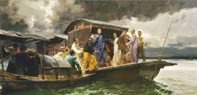總體來講,國家工程定稿的這張畫面較之浙江省那張在構圖、氣勢方面具有一定優勢。特別是我和黃發祥老師有了省里這張畫的制作經驗后,如何將全國這張畫得再好些也就有了一定的把握。然而在上正稿時,人物的安排卻依然面臨一些困難。例如:參加一大的毛澤東怎樣安排與表現?浙江的文史專家在審稿會上曾指出:一大代表中后來出了兩位重要人物,毛澤東和董必武,這是需要重視的。浙江省里的這張畫完成后,反饋的意見也集中在毛澤東的位置安排與形象塑造方面,主要問題是不夠突出。從歷史事實上講,參加一大會議的毛澤東,還是一位年輕的地方代表,但我們今天來創作這樣一件歷史畫作品,還需要考慮到中國共產黨后來的歷史發展情況,作為黨和新中國的締造者,毛澤東的形象應該放在一個比較重要的位置上面,這也是一種對于歷史的尊重。當然,不能太過頭,把毛澤東塑造為一大會議的主導者,所以,我們在藝術表現手法上動了一些腦筋。比如,毛澤東和董老盡管處于畫面的中心,但在處理上,毛澤東衣服的顏色稍暗一些,我們沒有將他放在船頭,而是放在了一個比較動態的位置上,確保了矗立在船頭的一大會議的幾位中心人物依然顯而易見。 “兩個中心”最終統一在代表們“匆匆上船”這一動態的合理性中了。從完成后的效果來看,這樣的處理基本達到了我們的目的。這個目的實際上也是我們創作的一個指導思想,在整個創作過程里,從構思、構圖到人物的安排再到人物形象的塑造無不以其為原則,即:將歷史事實與人們的“普遍記憶”恰如其分地結合在一起,這個指導思想成為我們在這次歷史畫創作中貫穿始終的核心。