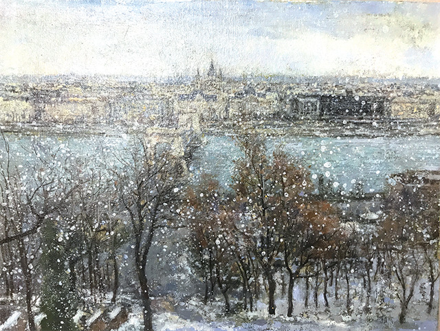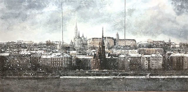 2014年春,我在北京畫院美術館初次見到了莊重的油畫作品。在他所擅長的倒影和俯瞰航拍主題作品中,最打動我的當屬那些淡雅朦朧的倒影系列。“有點兒巴比松、有點兒印象派、有點兒柯羅、有點兒莫奈”,是我對其畫作的第一印象。同是2014年,我因協助畫院籌備次年舉辦的齊白石首次境外大展而數次去往匈牙利首都布達佩斯,隨著對這座多瑙河畔的城市了解越多,好感也就油然而生。我喜歡住在布達山頂的漁人堡旁邊的酒店,并非因為這里守著旅游景點,而是因為這里離國家美術館只有咫尺之距,便于我觀展開會。記得初冬那次,恰好莊重發來微信問候,我隨手發給他一張我剛拍的照片,那是酒店窗外冬日晴空下的漁人堡和多瑙河。沒想到他很快回復,他年初才剛來過布達佩斯看過卡拉瓦喬大展,印象極好,也有頗多創作欲望,一拍即合的我們暢聊了許久。第二天由于時差緣故,睜眼已是國內時間午后,手機卻已有幾條微信留言。打開一看,莊重竟一夜之間根據我發給他的照片將兩幅油畫小稿創作完成。我看罷激動不已,兩幅小稿不僅契合我身臨其境之感,更是他最擅長的畫風,我隨即回復他,“你以東歐主題創作一個系列辦個展覽如何?我來給你策展。”于是,源于一張照片的偶然觸動,不謀而合的我們在近三年的不斷探討和打磨中最終呈現出本次“意象東歐”主題展覽。那張意外喚起他創作欲望和靈感的照片,則成為了展覽中的《布達佩斯之一》和《布達佩斯之三》,也是本次“意象東歐”展覽中藝術家最先完成的作品。
