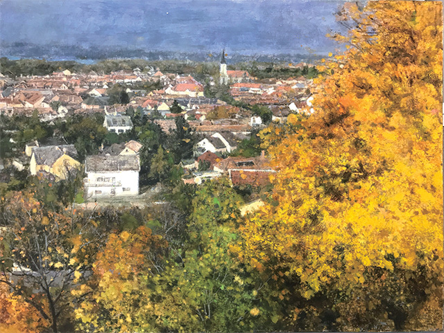 其次,拋開科學性的焦點透視觀察方法和從具象到抽象,從描繪形似到追求意境的創作手法演變,色彩始終是西方風景畫中最重要的元素。而莊重對色彩細致入微的敏銳和絕佳的把控感是令我印象深刻的。要知道,中國并非是油畫天然的土壤。我國名山大川中的層巒疊嶂與云霧繚繞,最適合用濃淡暈染的水墨來表達。反觀歐洲,經緯度差異所造就的光影變化、快速移動的低壓云層、鮮艷飽和的色澤濃度、加之歐洲人與生俱來的色彩感覺,構成了西方油畫中豐富的色彩關系。想更好地呈現歐洲風景,身臨其境的熏陶是必備條件。因為只有站在那片土地上,我們才可能明白英國為何能誕生透納;德國因何能出現大衛·弗雷德里希;法國緣何能成就印象派。小約翰·施特勞斯之所以能譜寫出眾人最耳熟能詳的《藍色多瑙河》,不僅是詩意的贊頌,更是眼見的真實。數次的東歐采風之行,在給予藝術家創作素材的同時,最重要的是去感受歐洲風情中的氣息。而身為土生土長的南京人,能夠在有限的旅行采風中去體悟歐洲特有的色彩關系并學以致用,則絕非寫生描摹畫照片那么簡單。幾次金秋時節的旅歐經歷,讓他通過展覽中整體偏黃的色調去應景地呈現多瑙河畔沿途金秋的美景。歐洲夕陽下映射在湖面那淡淡的紫、捷克境內普遍的紅磚色系屋頂與秋色那“奇妙的和諧”、晴朗天空下的藍色多瑙河、布達佩斯初冬彌漫在多瑙河上的灰調濃霧以及雪后建筑與自然間冷暖關系,莊重將這些轉瞬即逝的瞬間用畫筆詳盡地記錄下來,并渲染出專屬于自己的色調與記憶中的感覺。