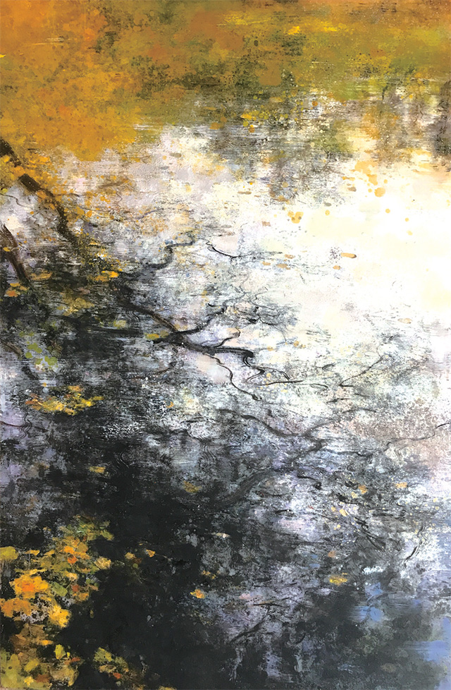 在西方油畫中,風景畫從最初文藝復興時期的配角到17世紀真正成為主角自成一派,再從羅斯達爾和洛蘭的寫實派、透納和康斯坦布的浪漫派到莫奈、畢沙羅和西斯萊等人的印象派,經歷了漫長的實踐和演變過程。但和我國傳統繪畫一樣,所有的發展都建立在對傳統的延續基礎上再創新。品讀莊重的作品,最令我欣賞的有兩點。首先,便是吸收西方歷代大師在風景畫創作中最獨特的元素并為己所用,從經典中汲取養分是從古至今每一位藝術家的必修課,但如何從臨摹別人的作品轉化為自己的風格卻絕非易事。如果把莊重較為代表性的倒影和航拍俯瞰兩個系列看作是他帶有實驗性的突破嘗試的話,“意象東歐”中的這組創作則顯示出他向傳統風景畫致意的決心。《無名小鎮》系列中樹木在風中搖曳的狀態帶著柯羅的痕跡;《秋色連波》系列中師法莫奈描繪荷塘中光影的斑斕;《布達佩斯》系列中描繪遠景時的虛無所借鑒透納的空氣透視,多位風景畫大師最具辨識度的細節都能從莊重的畫作中尋得蛛絲馬跡。這些元素匯集到一起,結合他獨立的個人視角,呈現出他心中的東歐印象。