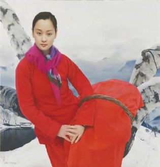 西藏獨特的山水、人物是畫家們畫此不疲的題材,同樣讓中國畫家們孜孜追求的還有農村題材。王沂東的作品《壩上春意》取材于沂蒙山區的風土人情,大雪壓枝低的冬季里,河壩邊顯現出一位身著大紅襖的姑娘,蕭瑟的冬季里乍現的大紅色恰如即將到來的春天帶給人的溫暖之意。“在構圖時我讓樹干、姑娘和籃筐形成了大‘V’字形,然而為了不使畫面構圖過于簡單,我將畫面右邊的枝干做了彎曲處理,破了一下畫面的純‘V’字形。 ”王沂東說。寫實繪畫與觀念藝術存在著天然的不可比性,它自有一套獨立的語言系統,不單單只是客觀地再現,在嚴格的造型基礎上,更需要對輪廓線的處理、結構的認知與強化、空間與解剖的結合、色層與色彩配合、筆觸肌理與質感的烘托等等有著精準的把握。“姑娘脖子上的圍巾,中間那一角的藍色是我刻意加上去的,原來并不是這樣,因為在大片的紅色中需要這樣一個顏色來進行對比,對整幅畫來說也是點睛之處。 ”在他筆下,沂蒙山區的一情一景、一人一物看似簡潔,簡潔中卻蘊藏著豐富的審美構思與藝術底蘊。
