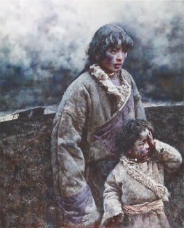 “新中國的第一代畫家是徐悲鴻、劉海粟等一批出國學習的畫家,后來還有靳尚誼、艾中信等一批畫家,之后就是我們這一代人。我們趕上改革開放,可以去世界各地看國外的博物館,受到不同文化藝術的影響。我們雖然形成了多樣化的風格,但是高技術含量、高水準、高難度,仍是寫實畫派堅持的標準。 ”作為新中國第三代畫家的艾軒站在自己的畫作《遠方的雷聲》前說。畫作中,大面積顏色暗沉的背景與人物臉上的蒼白形成鮮明對比,藏族小男孩捂住一只眼睛、露出的另一只眼睛里充滿惶恐而又好奇的神態被刻畫得極盡細致。兩個人物位于畫作前景中,身后的天空和草地都是一抹暗沉,艾軒以借人、借景為依托,巧妙地把孤寂的詩人一般的抒情與神秘感結合在一起。在鄉土寫實主義的畫家群中,走出了一條獨特之路,使得他的畫作充滿了生命力。