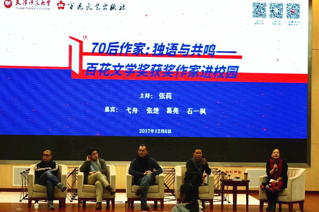70后作家是一個不事喧嘩的堅實、成熟的群體,成長過程經(jīng)歷了改革開放前后不同的社會形態(tài),紛繁的變遷與涌動的思潮使他們對于自我和文學的認知都明顯不同于新時期作家和“80后”作家。無論詩歌、散文還是小說創(chuàng)作,70后作家都顯現(xiàn)出一種冷靜而沉郁的氣質(zhì),并表現(xiàn)出越來越強烈的時代關懷和現(xiàn)實書寫,積極探索個人敘事與時代精神的融通與契合,向著歷史與人性深處不斷掘進,成為青年作家的中堅力量。2017年12月6日,獲得第十七屆百花文學獎的四位70后作家葛亮、張楚、弋舟、石一楓走進天津師范大學,與在校師生進行了一場主題為“70后作家:獨語與共鳴”的對談,共同研討70后寫作者的精神際遇與美學追求,分享個人寫作歷程。對談由天津師范大學文學院教授張莉主持。