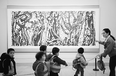 2017年11月17日,一名幼兒園老師帶著小朋友們在中國美術館參觀展出的吳冠中作品《根扎南國》。當日,“美在新時代——慶祝‘十九大’勝利召開中國美術館典藏精品特展”在這里向公眾開放。新華社記者 魯鵬攝
