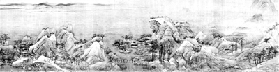 馮海濤:根據蔡京跋文及太清樓賜宴背景分析,這幅作品重點不是山水,而是隱士。在《江山圖》里畫了很多人物,不過都小如豆粒兒,如何能分清誰是誰呢?這涉及到手卷觀看方式,這樣大的手卷,信息含量巨大,閱讀時應從右至左依次展開,而不是一次性將作品完全陳列在眼前。《江山圖》的規模就決定了觀看只能是近距離的,這時人的視角所及基本上就是一個場景能夠獲得的空間,畫家正是利用手卷這種觀看特點來經營畫面。以宋代繪畫理論來說,就是“山水先理會大山,名為主峰”,而其它山峰則如“百辟奔走朝會”,也就是畫面的動勢線都向主山匯聚。山水畫除了主山,還離不開主樹。通過手卷構圖法則,《江山圖》中含有21幅相對獨立畫面。
