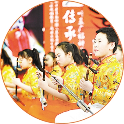 數十位小學生的京胡合奏拉開了展示的序幕。這些孩子側著腦袋,表情凝重,看架勢,如同老琴師的相仿。一抖琴弓子,引來陣陣掌聲。“小家伙,真專業。”一位老師不禁感嘆了一句,“這手腕子可夠要勁兒的。”