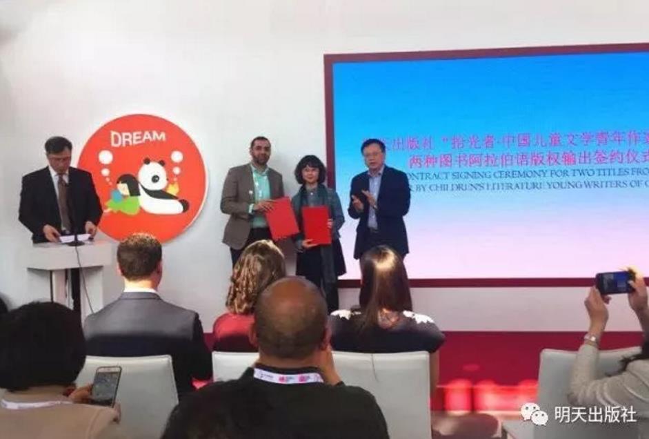 明天出版社與阿聯酋的庫坦出版社(Kuttab Publishing Company)合作,簽訂青年作家舒輝波的中篇小說《聽天使唱歌》、劉玉棟的中篇兒童小說《月亮舞臺》、龐婕蕾的兒童生活故事《我是大夢想家》的阿拉伯語的版權輸出合同。