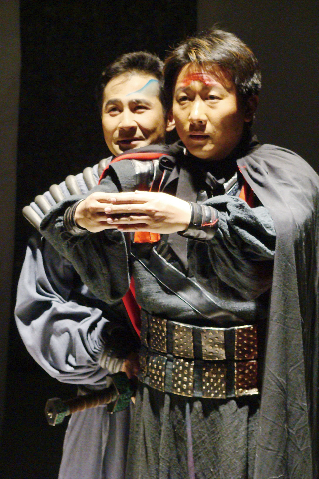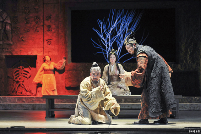 王曉鷹沒有滿足于這一種藝術領域里的“跨界”,他得隴望蜀地矚目著另一種“跨界”——跨文化。當今的各國民族戲劇,越來越頻繁地活動在國際文化的交流格局中,為什么交流,拿什么交流,在國際文化活動中就凸顯出來。在這樣的背景下,王曉鷹充滿文化自信地提出了戲劇演出創造中的“中國意象現代表達”,是對自己的美學創造的一個新要求。他自己回溯藝術生涯,認為早期的《荒原與人》《霸王歌行》,近期的《伏生》《杜甫》《大清相國》《蘭陵王》等作品中就已經越來越明確地向這方面努力。舞臺意象中濃郁的中國傳統文化、傳統藝術的意味神韻,演出形態中透著現代意識現代方式的色彩語匯,就是文化上的民族個性與手段上的現代意識的融合。歸根到底,王曉鷹正在著手努力的,是中國話劇表達的民族性與現代性相同一、相統一的世紀性、世界性難題。
