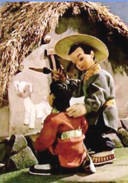 其次,原著中寫到統冶階級奪神筆時,先是財主,后為皇帝搶奪,其意固然在于使得矛盾沖突不斷激化,但也不免有故事情節的某些重復。洪汛濤對此作了刪除與改動,把財主與皇帝的暴虐行為集中在“大官”一人身上,這樣并不削弱原著的斗爭激烈程度,反而更加深了觀眾對統治者的印象。還有把原來搶寶遭懲的情節由兩次壓縮為一次,既精簡了篇幅,又顯得簡潔明了。
