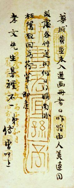 目前汪己文先生轉來法繪,拜謝之余極佩先生筆法墨韻,不獨深得賓翁神髓,亦且上追宋元明末諸賢,風格超邁,求諸當世實不多覯。吾國優秀藝術傳統承繼有人,大可為民族前途慶幸。惟大作近景用筆倘能為緊湊簡化,則既與遠景對比更為顯著,全幅氣象亦可更為渾成。溥心畬先生平生專學北宗,刻劃過甚姑勿論,用筆往往太碎,致有松率之弊。不知先生亦有同感否?