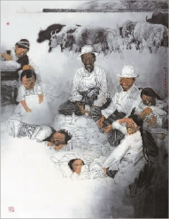 感悟羅江的藝術(shù)生命,可強(qiáng)烈體會(huì)到彝族人家國(guó)一體的新時(shí)代情懷。他在嫻熟運(yùn)用黑、白、灰墨色外,還善用褚紅色、蔚藍(lán)色、淺綠色、淡黃色,將各種顏色協(xié)調(diào)有度、變幻無窮,做到新奇而不俗、夸張而不艷,既烘托了中國(guó)畫大寫意的風(fēng)格,又深化了對(duì)時(shí)代、對(duì)生命的敬畏。同時(shí),他注重將新時(shí)代主題巧妙融會(huì)到藝術(shù)生命體系之中,牢牢掌控藝術(shù)走向與情趣,給作品賦予深刻熱烈的思想高度,讓每一幅作品都體現(xiàn)出對(duì)生活的摯愛、對(duì)生命的敬重、對(duì)祖國(guó)的責(zé)任。系列作品《烏蒙山》用豪邁凝練的大寫意手法,描繪不同生活狀態(tài)下彝族女人與牲畜的關(guān)系,表現(xiàn)出道法自然、天人合一的東方智慧。大型主題創(chuàng)作《誓盟》用細(xì)膩深刻的藝術(shù)風(fēng)格,講述云南26個(gè)民族代表一心一意聽黨話、跟黨走,為建設(shè)平等、自由、幸福的民族大家庭而奮斗的美好故事,體現(xiàn)出了火熱的民族情懷和愛國(guó)主義精神,具有厚重的精神內(nèi)涵和審美價(jià)值,也樹立起藝術(shù)服務(wù)人民、謳歌時(shí)代的鮮明導(dǎo)向。