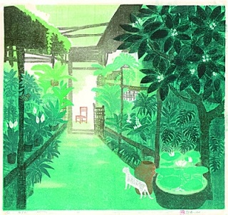去過(guò)鄭爽家的人,都會(huì)對(duì)她草木蔥蘢的陽(yáng)臺(tái)留下深刻印象。如果說(shuō)《我的陽(yáng)臺(tái)》是她對(duì)自己生活的如實(shí)描述,那么《后院》則更接近她理想中的家園。研究《后院》的原版會(huì)驚訝于它的簡(jiǎn)練。鄭爽僅僅用了4塊版,就營(yíng)造出了生機(jī)盎然、層次豐富的美好畫(huà)面。