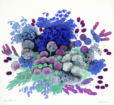 今天,我們熟悉的鄭爽版畫(huà)面貌大致可歸納為:作品不是單純對(duì)自然形態(tài)的摹仿,而是經(jīng)過(guò)概括提煉,巧妙地分版套色,蒼潤(rùn)兼濟(jì)的水分控制,以及對(duì)紙張肌理、木板紋路的細(xì)微感受,做足內(nèi)在功夫又蘊(yùn)藉內(nèi)斂,讓普通的靜物有了精神性的內(nèi)蘊(yùn)和力量。她擅用黑色,莊嚴(yán)穩(wěn)重中不動(dòng)聲色地烘托出其他色彩。她常用綠色、藍(lán)色等冷調(diào)顏色,少用暖色,即使有也是接近大地色系的土黃、赭石和熟褐。她在克制中展示精神性的高貴,探討趣味的雋永,在水色氤氳中大家格局盡顯。這種“鄭氏”語(yǔ)言大概在20世紀(jì)70年代末、80年代初逐步形成,到1981年創(chuàng)作出《繡球花》,鄭爽的版畫(huà)語(yǔ)言基本成形,1984年她創(chuàng)作出《黑牡丹白牡丹》,至此她的水印木刻語(yǔ)言進(jìn)化已然完成。此后的一系列花卉作品都延續(xù)了這一風(fēng)格,只是在語(yǔ)言精純度上繼續(xù)深化與提升罷了。