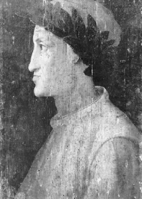 這幅木板油畫描繪的是意大利最偉大的詩人、西歐文學巨擘之一——但丁(1265年- 1321年) 。與紀念章一樣,我們看到的只是詩人的側面,頭上戴著月桂樹枝條編制的桂冠,象征其詩歌創作上的成就。