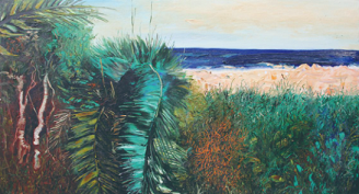馬杰在2015年創作了“綠島”系列作品。《月亮灣》《深藍色的海》《午后的海》用寫實的方法再現了海南島東部沿海地區的自然景色。海南東部地區雨量充沛,陽光明媚,沿海地形復雜,植被茂盛,處處透露著靈光與精氣,他習慣依據自己的感受,有意選擇靚麗的自然景象與構圖,以油畫特有的色彩、顏料和筆觸,直接、肯定地表現出自然景色的美、狂野與豐富。所以,他的筆下出現了更多以熱帶植被為前景,色彩強烈而豐富繁多的綠島系列的作品。《海邊的木麻黃》《叢生(九)》《叢生(四)生長》等作品則強調繪畫語言對繪畫主題的表現。狂放的筆觸、恣野的線條,甚至有意識地控制不經意的繪畫,不僅把喜歡的景物畫出來,還通過繪畫反映出自己對生活以及油畫藝術的理解。與此同時,馬杰還常選取一些獨具特色的海南風景,以較特殊的角度進行描繪,如一塊白云、一片草地、一棵矗立的椰子樹,運用鮮亮飽和的色彩與快速跳躍的用筆,讓色彩在密集的筆觸交融中,與環境融為一體,畫面既呈現出清新宜人的格調,又不失活潑律動的節奏。《白云》《搖曳的風》《寂靜的風景》等作品,都是這種類型的創作。