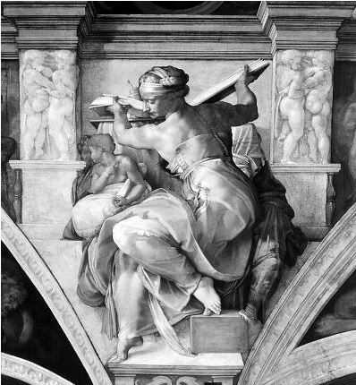 米開朗基羅為梵蒂岡西斯廷教堂所繪天頂畫的一部分《女預言家利比亞》。