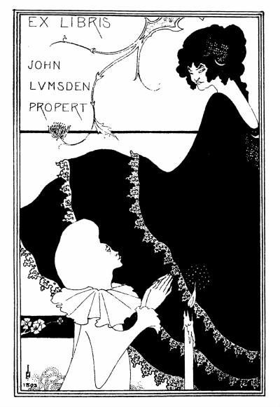 約翰·拉姆斯頓·普羅伯特設計的藏書票。比亞茲萊善于用大面積、強烈對比的黑白塊面,表現出設計理念和手法的獨創性,線條極為單純,沒有陰影,更沒有中間色調。