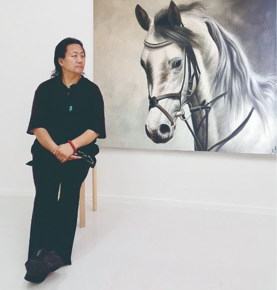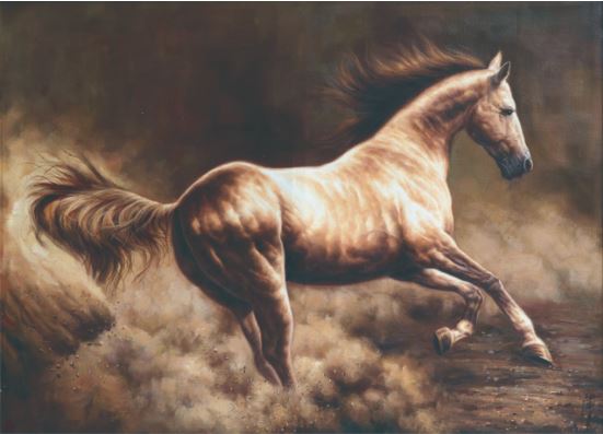 離開草原后,我投入到文學創作中,從《長江之歌》、中國共青團團歌《光榮啊,中國共青團》到中國武警主題歌《忠誠衛士之歌》,戎馬一生的我陰差陽錯地成為一名軍旅作家。歲月流逝,蟄伏于心中的駿馬情結卻依然濃烈。十多年前,我結識了青年畫家黃廣亮,他熱情、爽朗、謙遜的個性吸引了我,而他筆下的馬,更令我贊嘆不已。他畫的馬惟妙惟肖,無論奔馬、立馬、馬群都賦予了充沛的生命力。在廣亮的筆下,一匹匹駿馬奮鬃揚蹄,挾風而進,在廣袤的土地上飛奔。有的騰空起飛,有的蹄下生煙,有的回首顧盼,有的長嘶吶喊,仿佛都要破紙而出。馬的眼睛閃閃發亮,無論你從哪個角度看,它的目光都好像在追隨著你,似有無限的眷戀之情;那挺拔的骨架像躍動的山峰,長長的鬃毛似緞帶凌風狂舞,有力的脖子若龍頸屈伸,寬闊的胸膛肌肉抖動;凸起的血管青筋,你似乎能觸摸到那種血脈僨張的力量;鋼打鐵鑄般的四肢騰挪勁健獵獵生風,仿佛一旦踏上大地,就會擂響奮進的戰鼓;張大的鼻孔有若噴筒,好像吹口氣,這些馬就能打著響鼻從畫布上跑下來……廣亮畫的馬,剛勁矯健、陽剛大氣激蕩其中,揮灑著北方人豪爽豁達、抱志不屈的天性,溶鑄成了自由奔放、宏偉壯闊、縱橫豪邁的藝術風貌和大美境界。