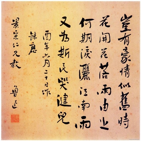 郭沫若是才子,他的書(shū)法從前備受推崇,地位極高,他寫(xiě)得也多,到處可以看見(jiàn)他的題詞墨跡。但看得眼熟了,覺(jué)得“郭體”似乎沒(méi)有魯迅書(shū)法蒼老的風(fēng)骨,也少一點(diǎn)茅盾書(shū)法的峻秀,所以也有人說(shuō)他的字盛名難符。