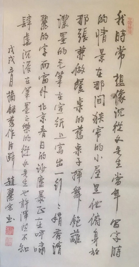 第二年我去北京把沈從文的書(shū)法長(zhǎng)卷還給曹辛之時(shí),他欣然一笑,說(shuō):“我以為你不想還我了呢!”說(shuō)罷,拿出家里所有的沈從文書(shū)法,讓我仔細(xì)欣賞,并且一定要我從中挑選一幅。