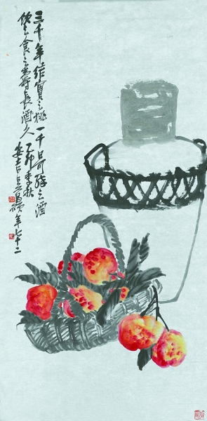 展廳中,《桃宴酒壇圖軸》作為首次與大眾見面的作品,不僅位置醒目,且經過了重新裝裱。吳昌碩將桃與酒壇并置一畫,取其“高壽”“長久”之意,題跋中“三千年結實之桃,一千日可醉之酒,飲之食之壽長久”更是直截了當地表達了祝壽的吉祥含義。復色的疊加是吳昌碩用色的特點,畫中壽桃運用洋紅、藤黃等色,將桃子成熟時期的飽滿狀態表現得淋漓盡致,而竹籃、酒壇則充分體現出中國畫“墨分五色”的藝術精髓,通過濃淡干濕的墨色變化,營造出豐富的畫面層次。