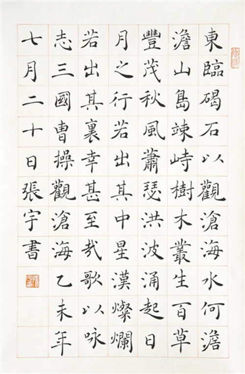 能夠把楷書寫好的人,也一定是個有溫度、有深度、有廣度的人,因為它考驗著一個人的定力和對書法藝術(shù)的理解。因此,在我看來,無論是為人處事還是為藝作文,張宇都足以成為楷則。