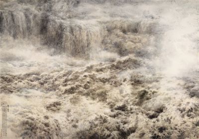 每一個草稿,都是向“完美”逼近的階梯。初稿之一“大塬靜涌遠(yuǎn)去”,于2013年9月在中國國家博物館草圖觀摩展中受到充分肯定,但宋雨桂深感還沒有畫出他心中的黃河,于是開始重新思考。第二稿選擇“壺口”為節(jié)點(diǎn),更適于表現(xiàn)“黃河之水天上來”波瀾起伏、洶涌奔騰的氣勢,彰顯其濤聲澎湃、川流不息的精神。這一設(shè)計(jì)稿于2014年6月完成,雖然同樣在草圖指導(dǎo)工作會上得到好評,但宋雨桂依然在推敲如何更好地表現(xiàn)和處理水勢,以使畫面呈現(xiàn)出一路挾雷裹電咆哮而來經(jīng)久不衰的黃河氣概。為突出“魂魄”,他再次否定了“深溝翻滾而下”常規(guī)的黃河瀑布表現(xiàn)形式。2015年完成的第三稿設(shè)計(jì),畫面構(gòu)圖大膽,摒棄石頭河岸等常規(guī)思維,用水的力量支撐黃河之水咆哮而來的氣勢。于是,鏗鏘有力、洶涌而下的黃河瀑布,成為畫面主體。急流忽上忽下、忽左忽右,暗喻畫面里藏著兩岸的山,水底的石托起黃河的驚濤駭浪,掀起萬丈狂瀾。這更能體現(xiàn)黃河博大寬厚、柔中帶剛、勇往直前的精神。