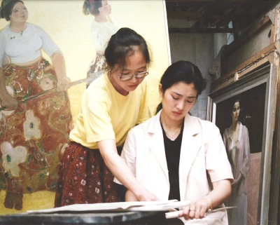 1992年,任麗君(左)和鞏俐在畫室。(均資料圖片)