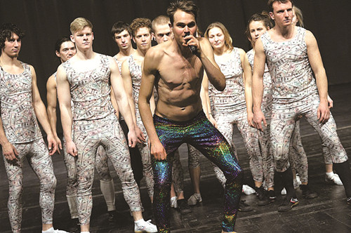 伴隨著《費城的街道》前奏的鼓點,6名演員自由伸展著軀體,猶如嬰兒般從舞臺正上方“呱呱墜地”,降臨在柏城。一瞬間,6名演員增加到了16人,預示著城市人口的迅速積聚。身著七彩緊身褲的男主角手持話筒,漸漸脫離了集體節奏,他一邊慌忙地穿行其間,驚異地看著其他15個人做著各種奇怪的體操動作,一邊講述著此時此刻的不安與緊張。沒有人關心他內心的傾訴,也沒有人在乎他的表演,他究竟是誰?在音樂結束的那一刻,男主角以一種幽默的方式拉出一條寫有“法茨”的布簾,他告訴觀眾,這里即將上演的是布萊希特的作品,而他正是這個戲的男主角法茨。《殺死汝愛》以布萊希特1926年至1930年間創作但始終未完成的劇作《自私鬼約翰·法茨的滅亡》為基礎,重新演繹了法茨的人生悲劇。劇中,觀眾仍可隨處發現布萊希特敘述體戲劇的形式和影響,但是波列許更為在意的是怎么讓文本為他的表達服務,讓法茨這個人物,更確切地說,讓扮演法茨的法比安·辛里希成為其觀念、藝術邏輯的一部分,完成劇場對現實的介入與批判。