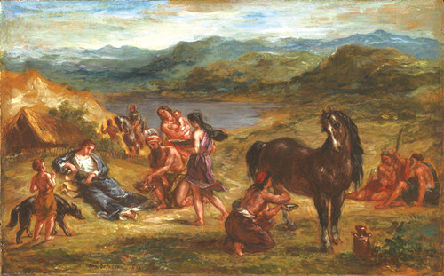 不過(guò),德拉克瓦并不那么贊同庫(kù)爾貝反映社會(huì)現(xiàn)實(shí)的“活力藝術(shù)”觀,而更醉心于歷史傳說(shuō)。柯姆·卡爾布強(qiáng)調(diào):“德拉克瓦早在馬賽爾·普魯斯特之前,就在他的《日記》中表達(dá)了一種奇特的思想,即‘回憶與創(chuàng)作的平衡機(jī)理’,按照每一個(gè)體固有之模式,通過(guò)無(wú)意識(shí)記憶來(lái)實(shí)現(xiàn)視覺、味覺和感覺必要的融合。在他看來(lái),憑回憶作畫乃是連接所有繪圖成分,保持整體和諧最可靠的方式。將現(xiàn)實(shí)的因素與其他文學(xué),或更久遠(yuǎn)的創(chuàng)造果實(shí)相配合,定能保持其藝術(shù)特性。”柯姆·卡爾布又說(shuō),德拉克瓦受時(shí)代感應(yīng),在《奧維德隱居斯基泰人部落》一畫中繪出了藍(lán)霧繚繞的山崗和密遐的遠(yuǎn)方,仿佛進(jìn)入勝境,寄托藝術(shù)家的奇異思索。德拉克瓦畫古羅馬詩(shī)人、《變形記》作者奧維德立在一匹紫騮雌馬旁邊深思,好似自己晚年仍在考量中探求“回憶機(jī)理”的畫面。