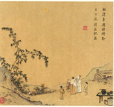 在中國傳統繪畫中,以“舉杯邀月”為主題的創作并不少見。天津博物館藏宋人《月下把杯圖》,傳為馬遠所作,圖中遠景闊遠凝凈,空中一輪明月高懸,月光灑滿山間。圖中近景的左側是山麓緩坡,其上翠竹叢生,竿曲葉垂,給月夜增添了幾分秀媚;近景右側擺放幾案,案上置酒爐,前邊不遠處有一個柱欄圍起的平臺;近景繪兩位惜別的舊友,在姣好的月夜美景中會聚,相對而立,舉杯恭賀。