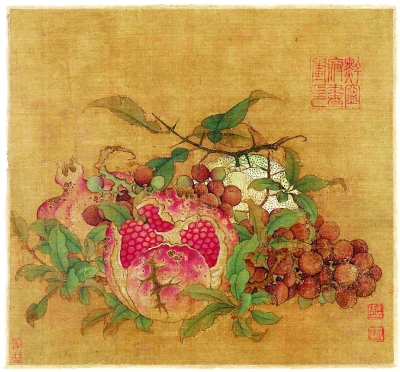 中秋美食豐富多樣,畫家筆下的花果佳肴也姿彩斐然。美國波士頓美術館藏有南宋畫家魯宗貴的《吉祥多子圖》,畫中的橘子、葡萄和石榴采用鮮艷明麗的色彩和密集的構圖,果實在綠葉的穿插映襯下顯得格外突出,黃、紅、綠、白多種顏色絢爛多彩。橘子、葡萄和石榴都是中秋時節受歡迎的花果,在中國傳統風俗中,這三種水果還具有多子多福的寓意,喜慶吉祥。