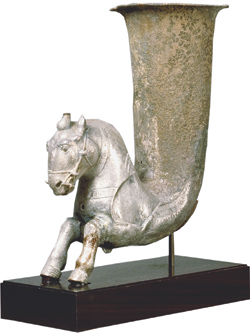 展覽現場不難發現很多牛的形象,其中閆志特別介紹了一件伊朗出土的牛形陶器,“這件陶器看起來很‘萌’ ,而且造型帶有強烈的現代感,但它的年代實際上是在公元前1200至800年左右,距今已經有3000年的歷史了。 ”展覽第二部分的展柜里擺放了大大小小不同造型的牛,都是在西亞、伊朗地區出土的,而在展覽第一部分的藏品中也能發現很多牛的形象,比如陶器上牛的紋飾、牛形酒壺等。閆志介紹,瘤牛在古代的西亞、印度、非洲等地區被視為家畜來飼養繁育,而以公牛崇拜為核心的宗教則發源于西亞,并向四周傳播。“牛在人類早期文明中的作用巨大,對牛神的崇拜也遍及絲綢之路沿線地區。因此在展現中我們可以看到許多牛的形象,從希臘到兩河流域到伊朗甚至到印度北部。我們把這些牛擺在一起,讓大家看到不同時代、不同地域,人們對牛的崇拜是多么的相似,這也是我們在策展當中的一個思考。 ”
