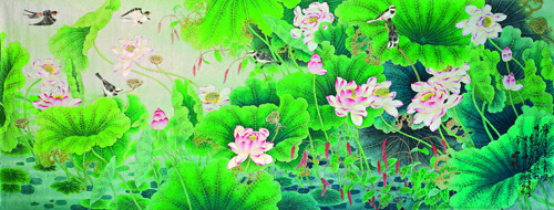 然而,今觀乎《接天蓮葉無窮碧》者,其表現(xiàn)之佳趣,或可近此。挹得天趣,蘊無限的生機,爛爛漫漫,鋪展開去,一路的悠遠(yuǎn)、浩蕩,讓人心靜如水。這是對高遠(yuǎn)精神的禮贊。